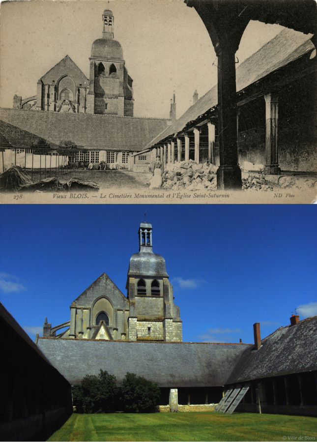 S’il y a bien un lieu confidentiel à Blois, c’est l’aître Saint Saturnin, situé à côté de l’église du même nom, au cœur du quartier Vienne. Bâti à la Renaissance aux alentours de 1516-1520, il sert d’ossuaire et succède ainsi à l’ancien cimetière paroissial, devenu trop exiguë. Désaffecté au moment de la Révolution, l’aître (dont le terme vient du latin atrium) est reconvertit en buanderie, annexe de l’hôpital général en 1807. Les galeries à colonnes qui servaient initialement d’ossuaire sont désormais utilisées pour le lavage et le séchage du linge. C’est le Conservateur Lesueur qui prend fait et cause pour l’aître et qui le convertit en dépôt lapidaire, de 1923 à 1934. Le service mutualisé des Archives de la Ville de Blois, d’Agglopolys et du CIAS du Blaisois, conserve dans ses fonds, hormis les registres paroissiaux, des documents relatifs à l’administration du Culte, aux cimetières, des plans, courriers et différentes photographies du monument. Bien que ces registres soient disponibles à la consultation directement sur le site internet des Archives, les exemplaires originaux mériteraient d'être un jour restaurés. Des sources diversifiées donc, de quoi mesurer l’évolution du lieu et constater à quel point il était important de le préserver et de le restaurer. Les travaux de réhabilitation, lancés en septembre 2024, devraient s’achever en 2026.